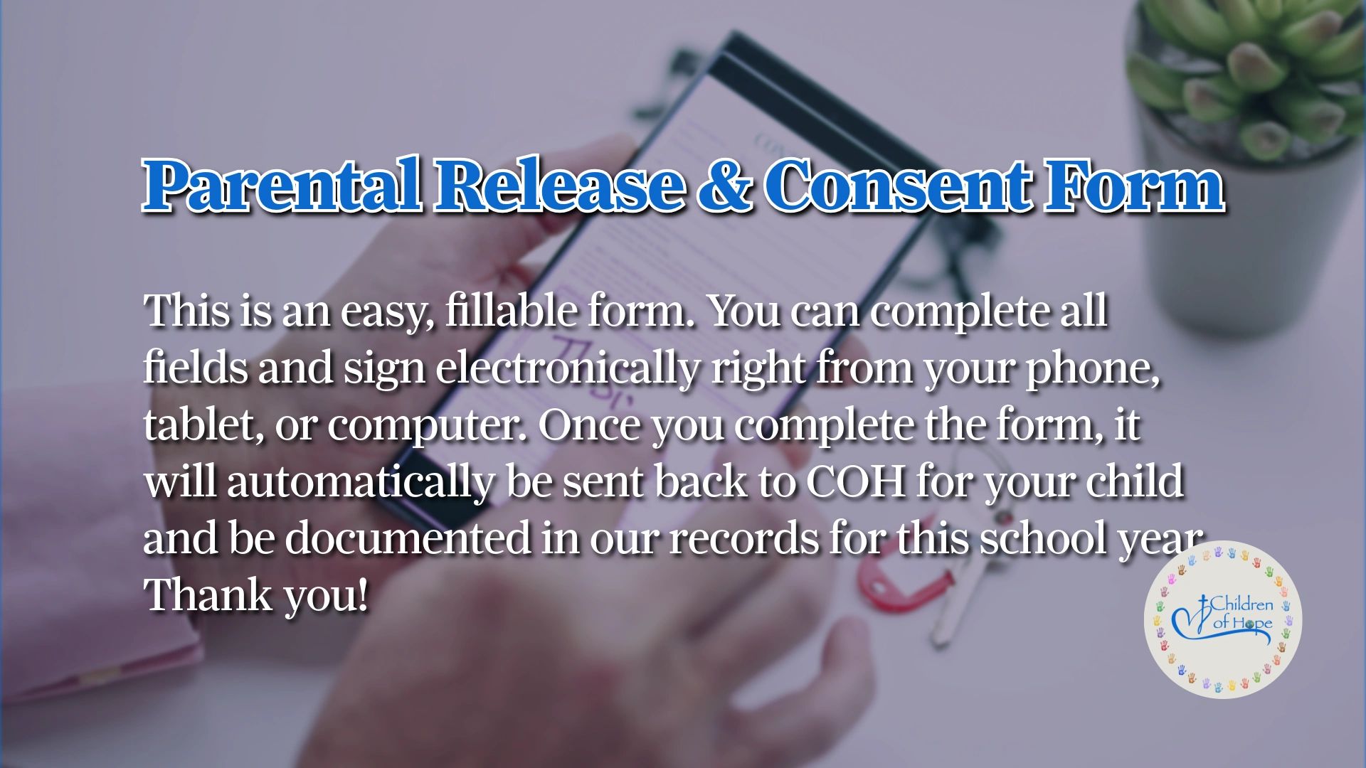 Please complete our new, fully electronic, 2025/2026 Parental Release & Consent Form at the button below to allow your kids to attend any COH events, functions, or trips for this school year. This form must be completed annually. Once you complete it, the form will automatically be sent back to COH for your child.